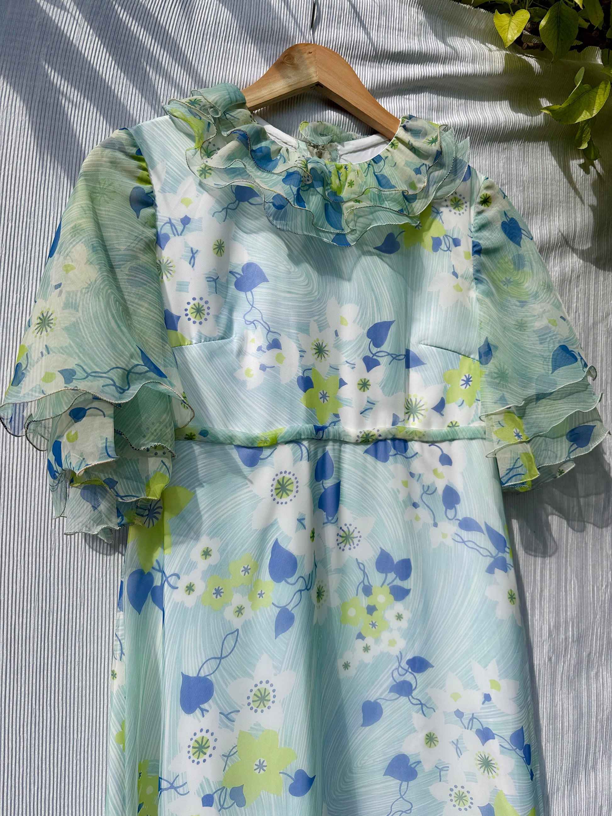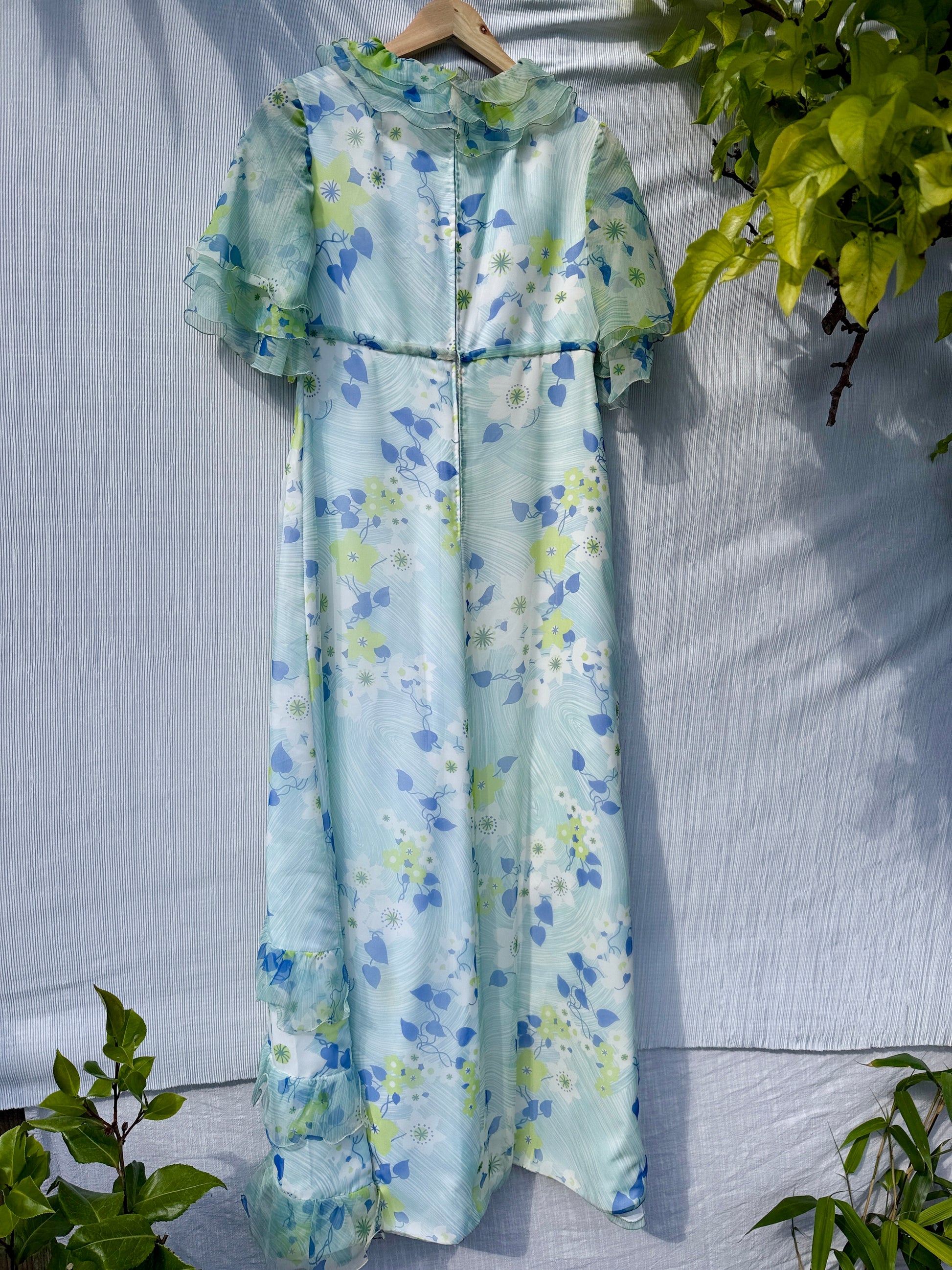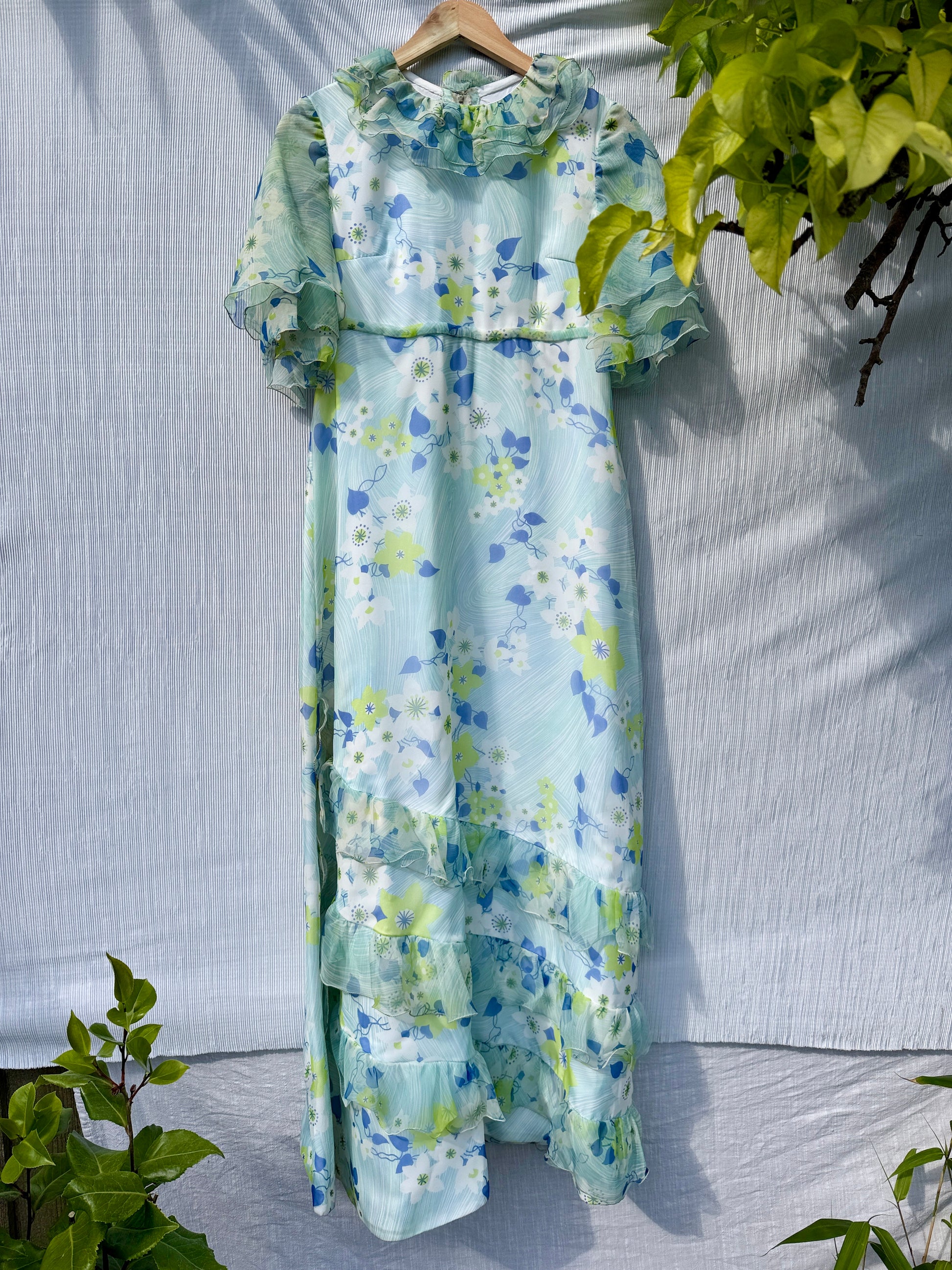 Incredible Vintage Floral Short Sleeve 70s Maxi Dress with frill trims.