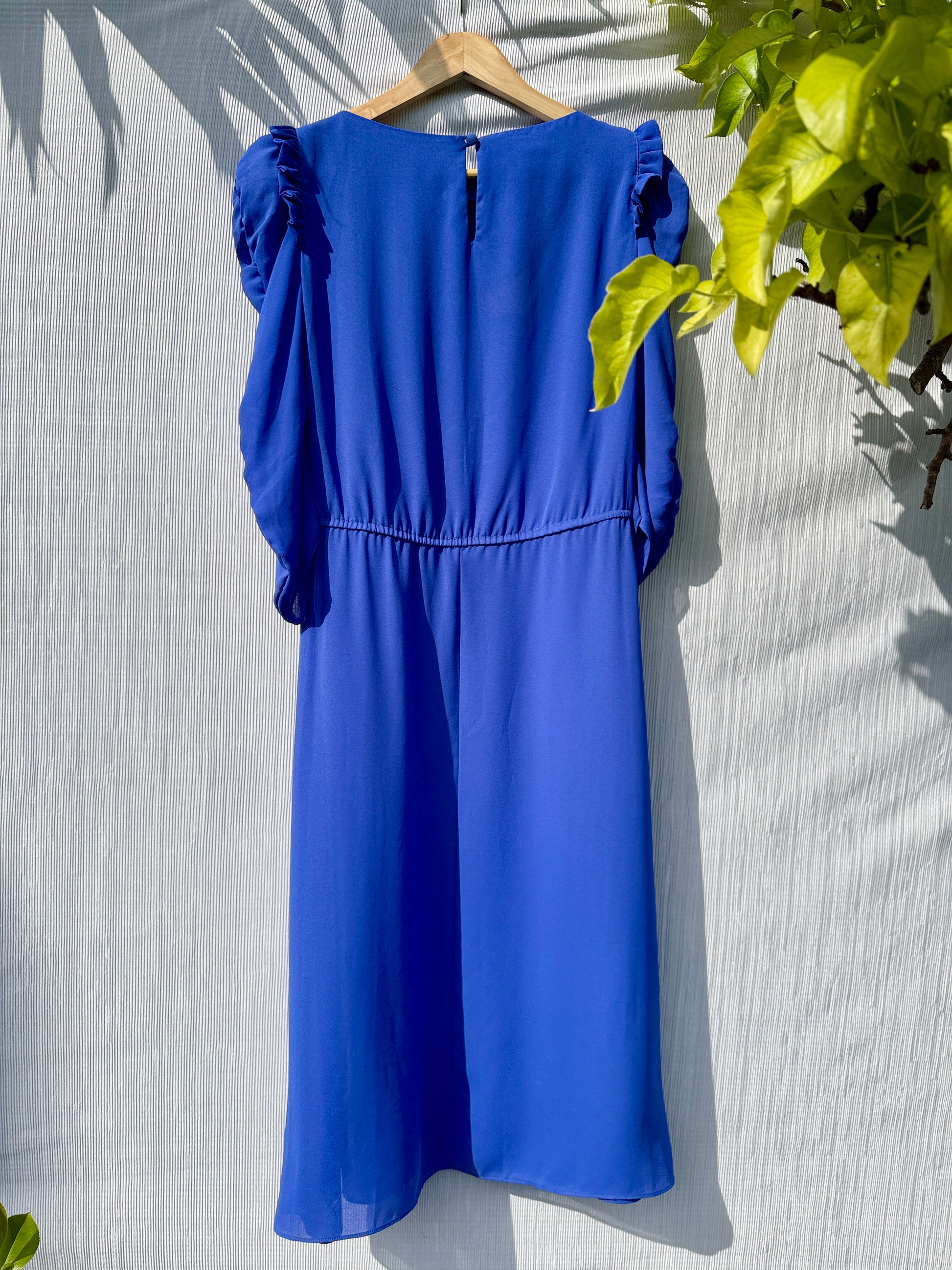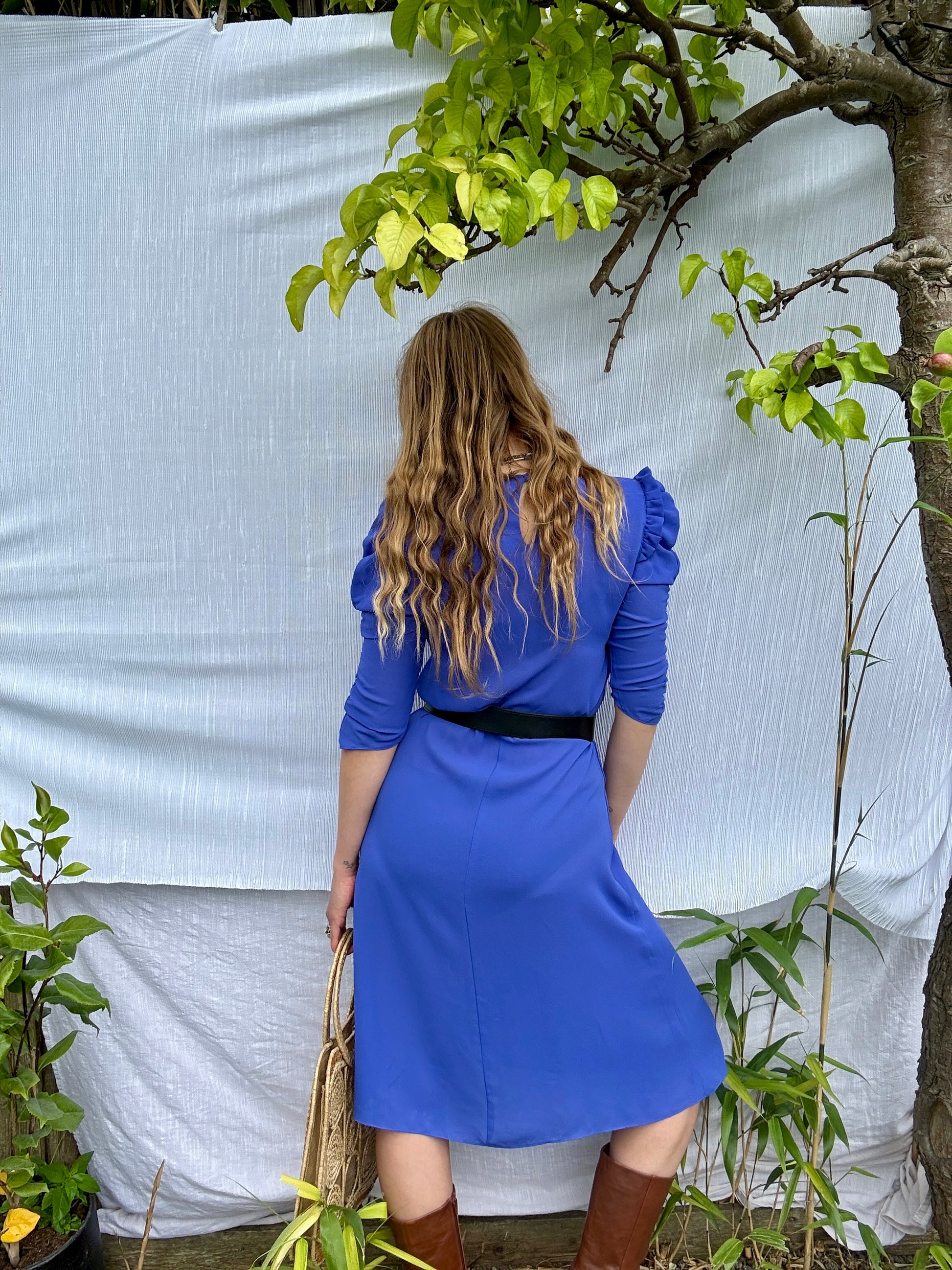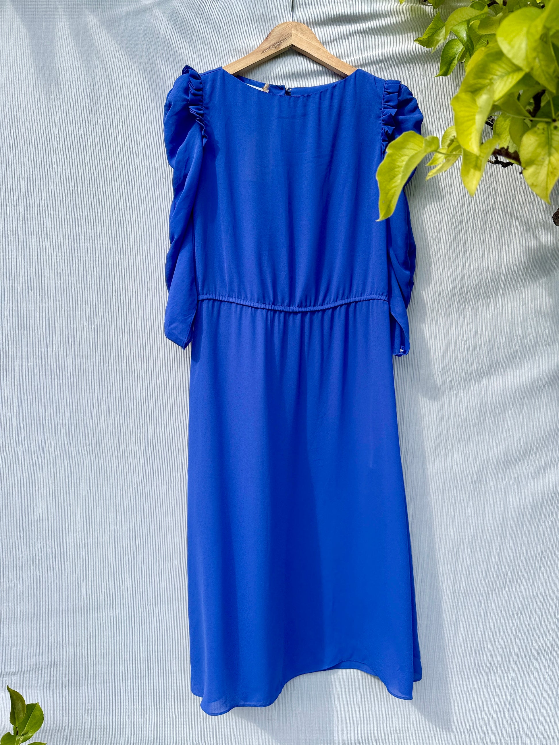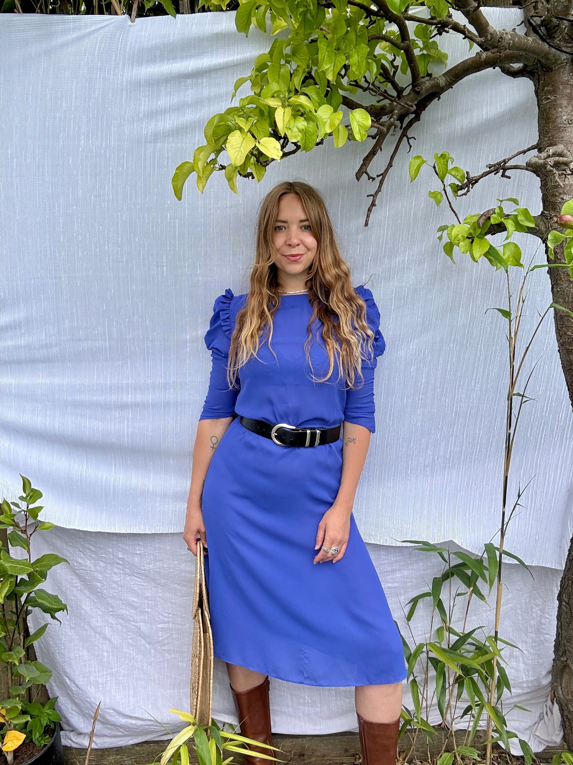 Stunning Vintage 3/4 Sleeve Blue 80s Dress with frill details and ruched sleeves