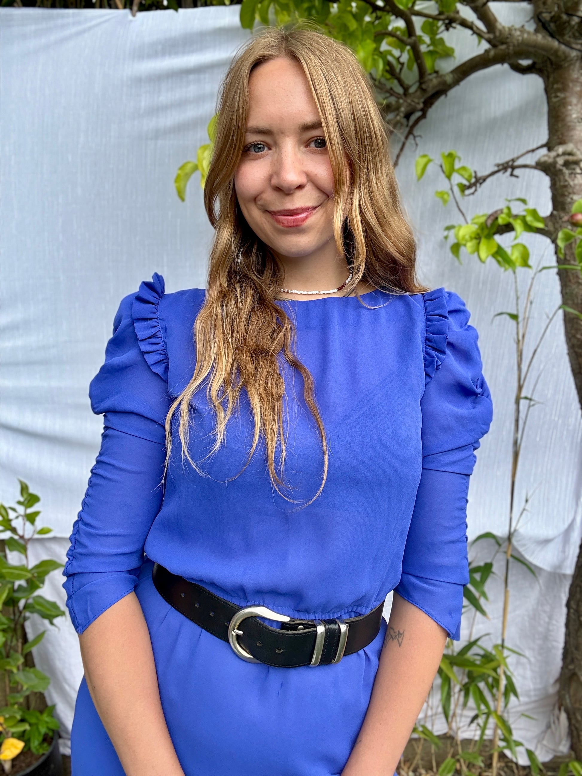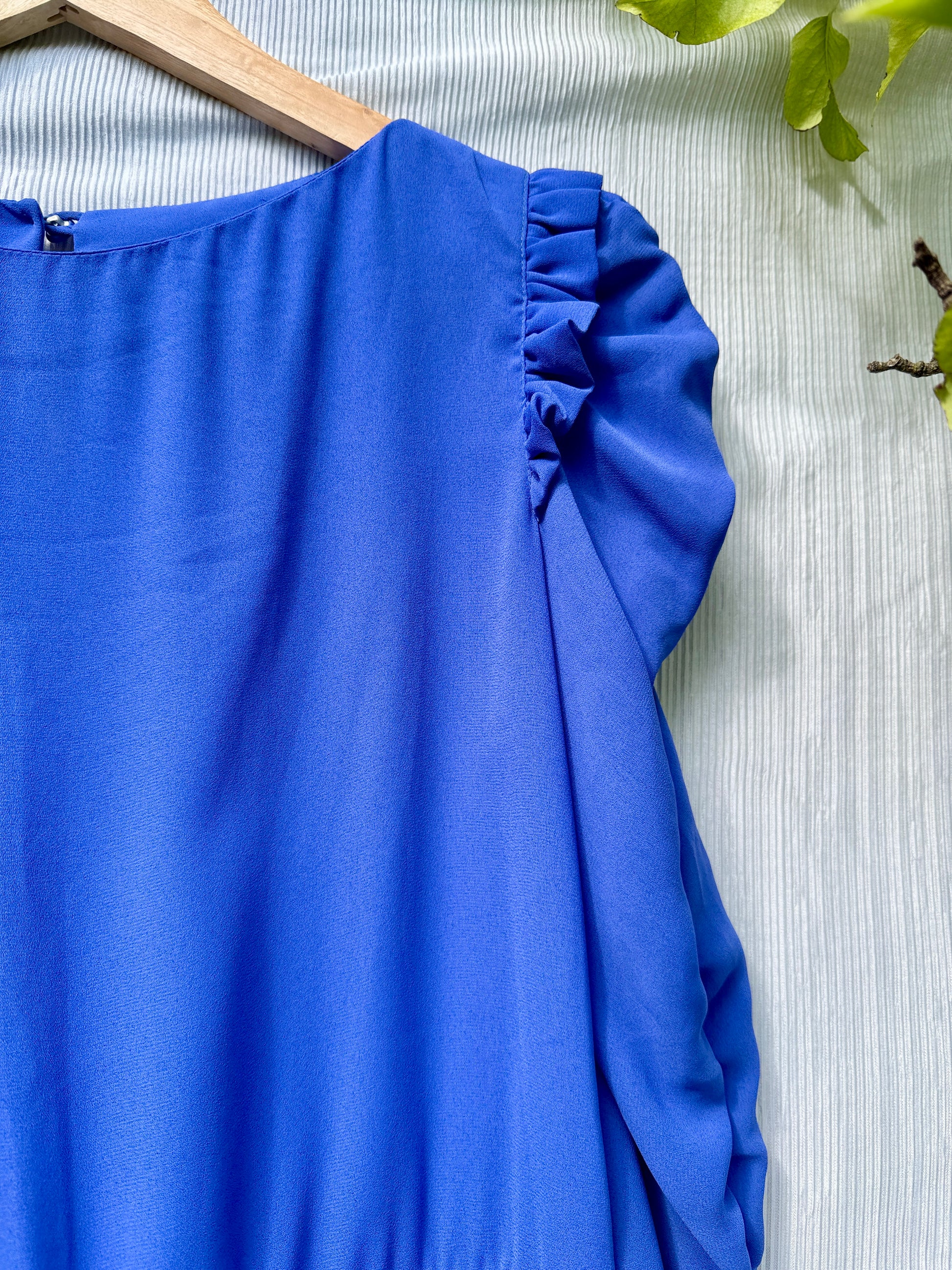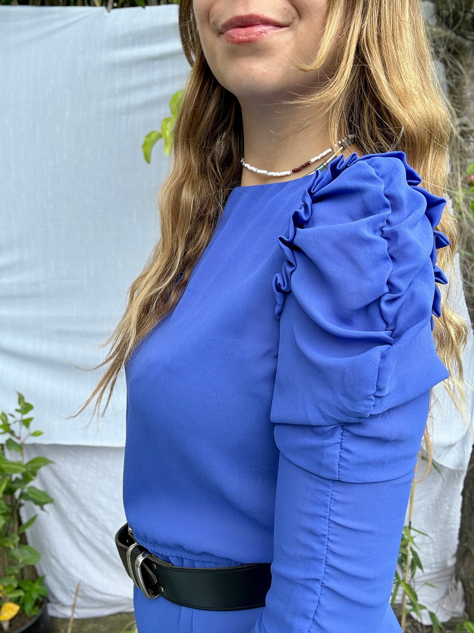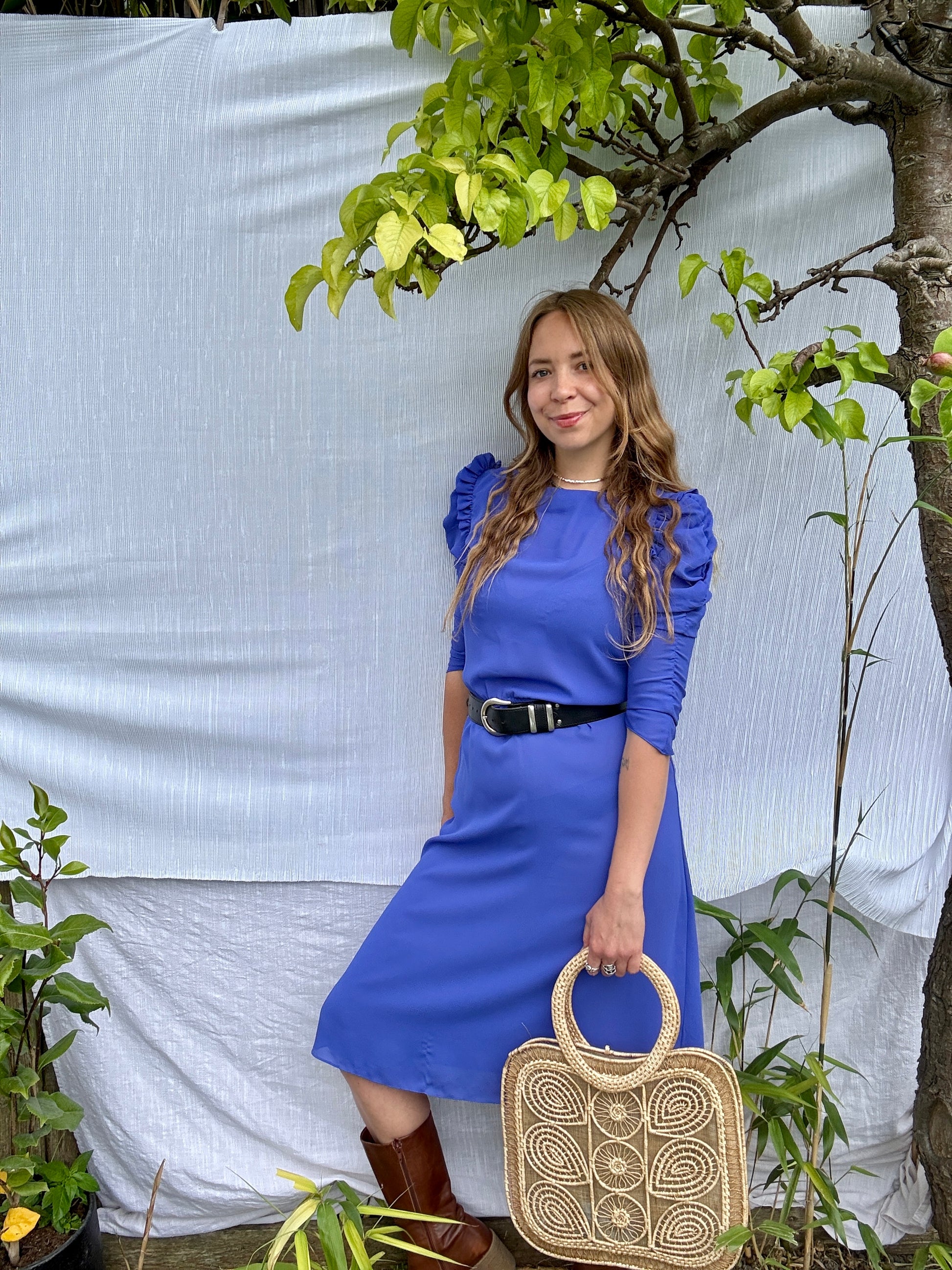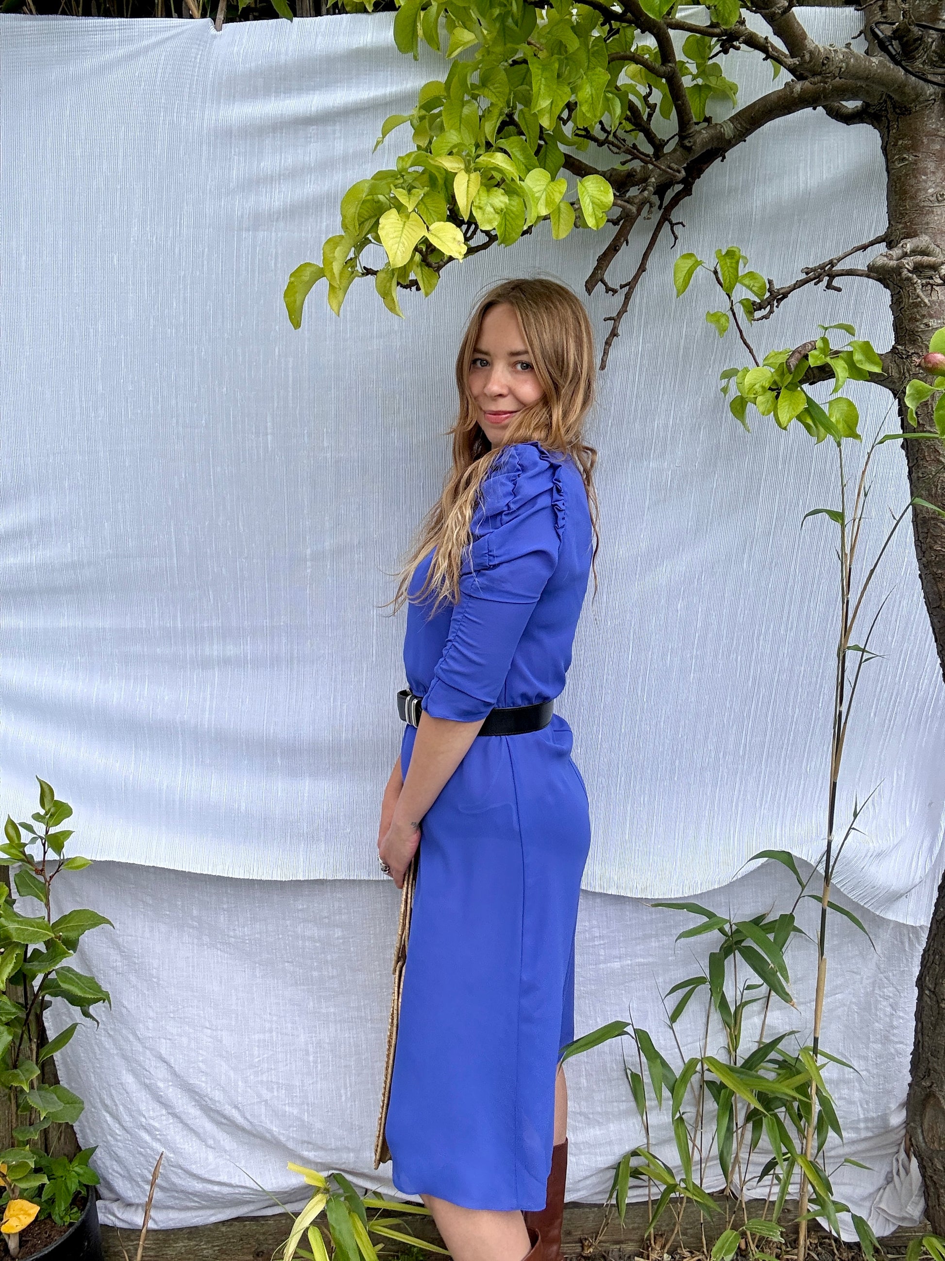 Stunning Vintage 3/4 Sleeve Blue 80s Dress with frill details and ruched sleeves