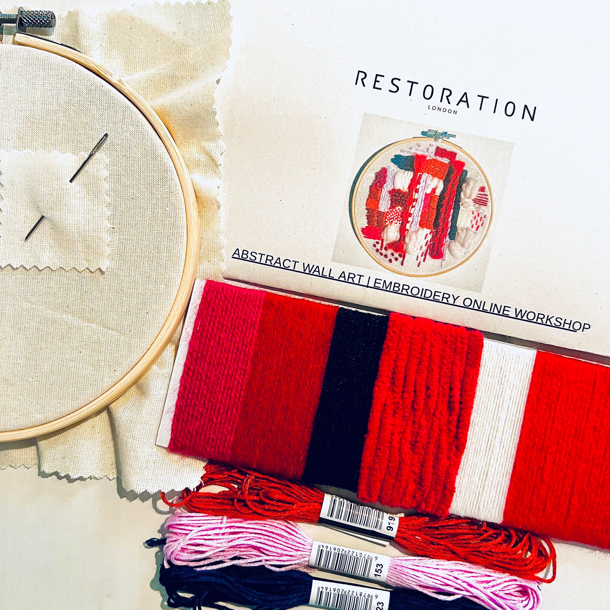 In this kit you have all the tools you need to learn the basics of Hand Embroidery. You will learn 10 various embroidery stitches, exploring texture, as well as experiment with colour, yarn, and different patterns to create your own abstract wall art.