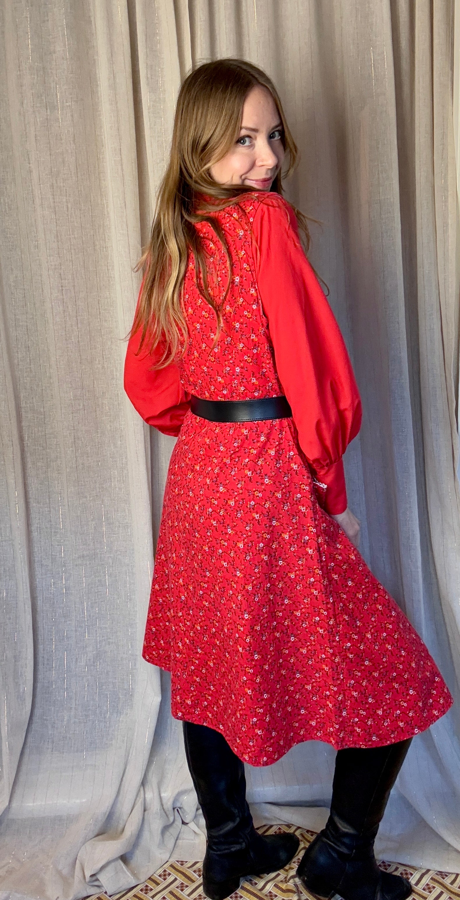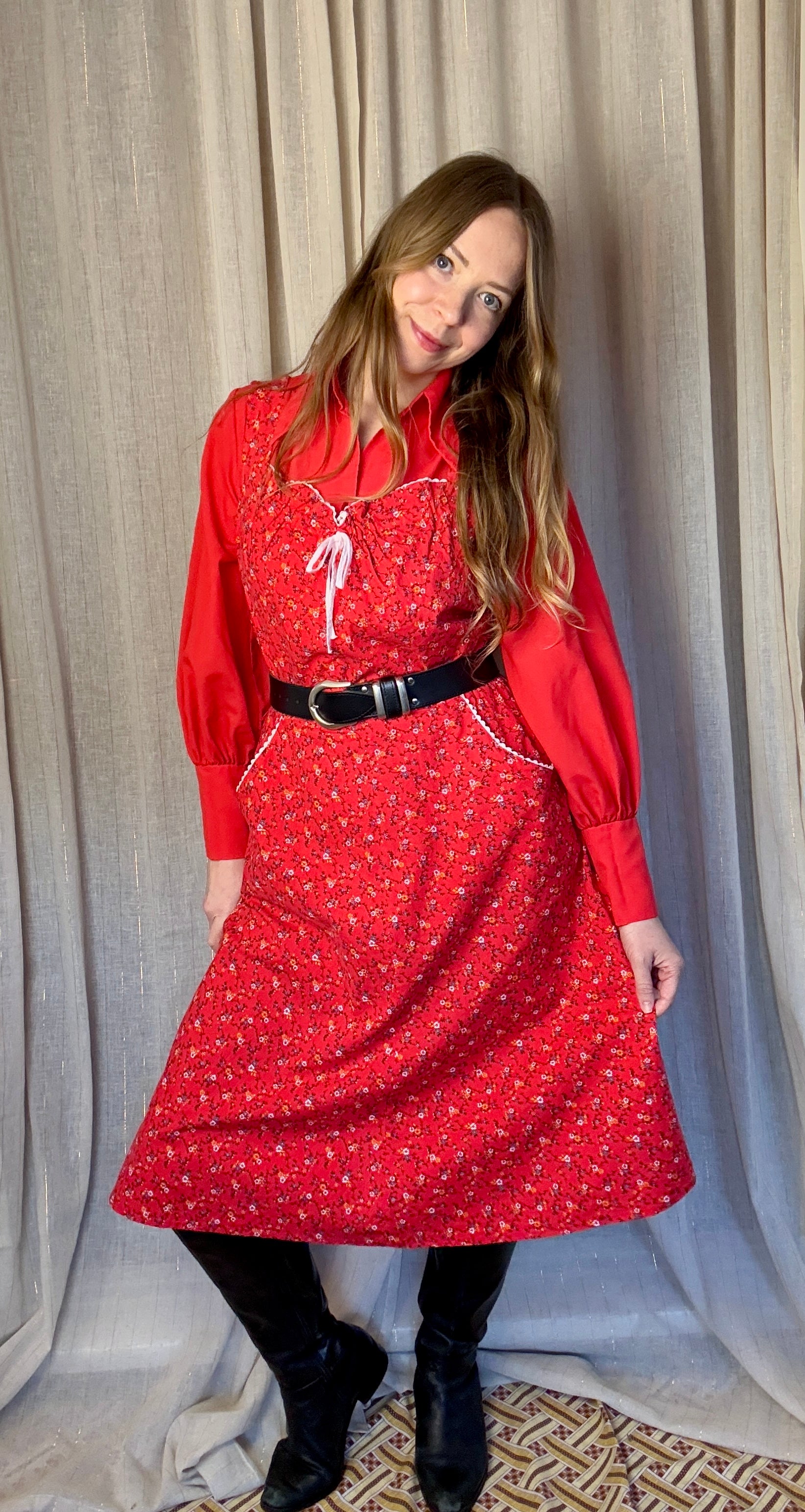 Style with a cute vintage blouse underneath and vintage boots.
