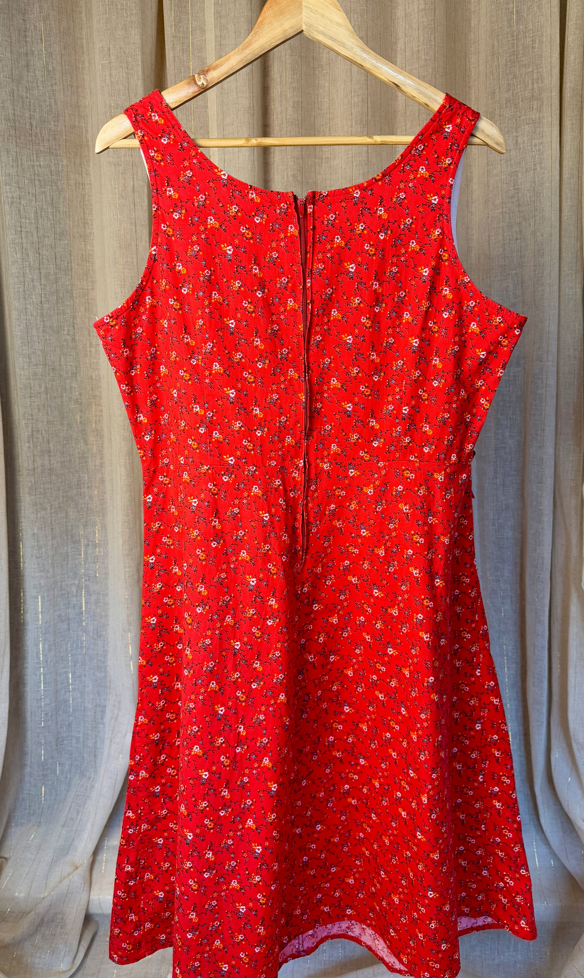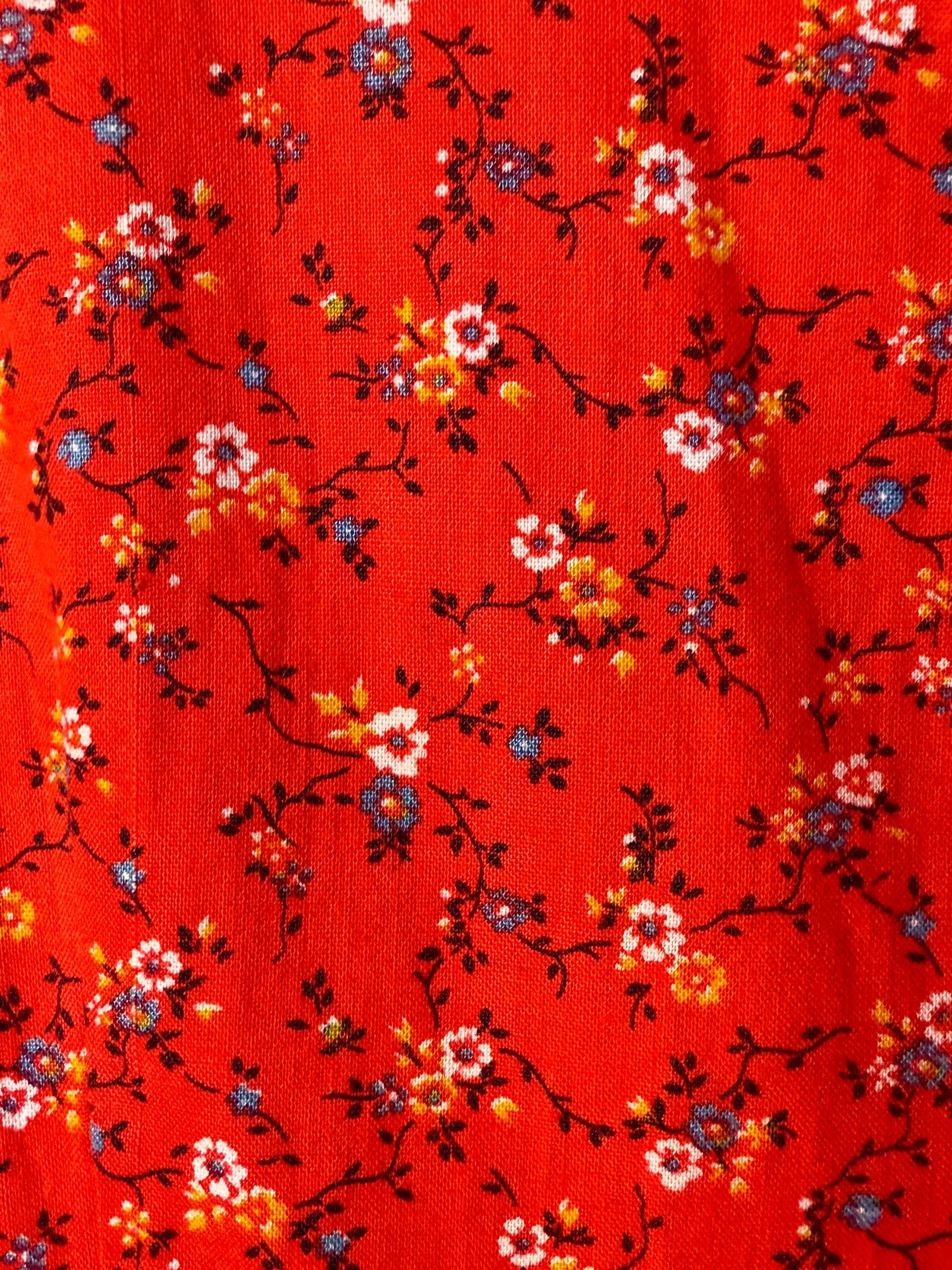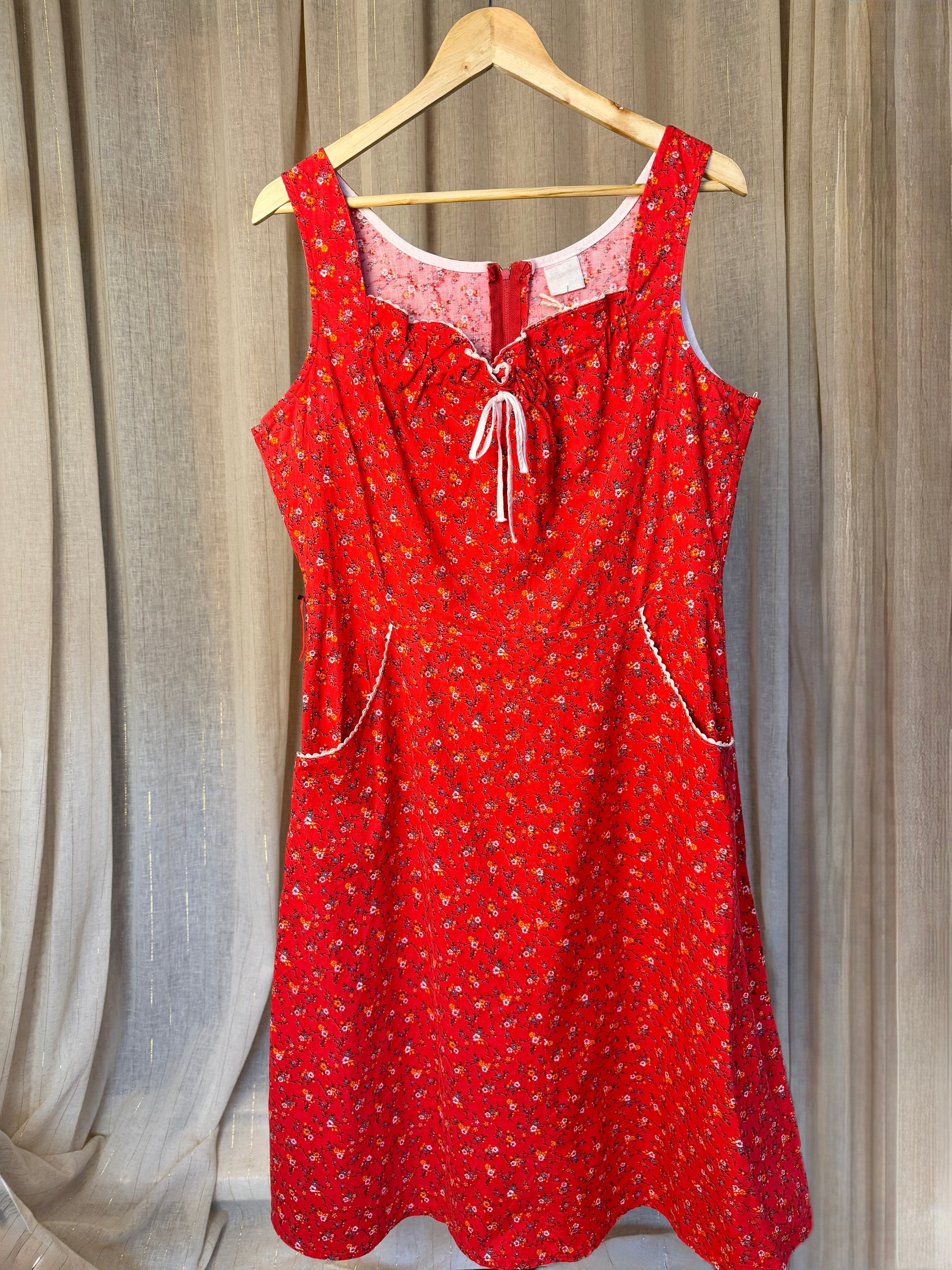 Vintage Red Floral Summer Dress with pockets. Gorgeous gathered bow detail on the neckline and back zip fastening.