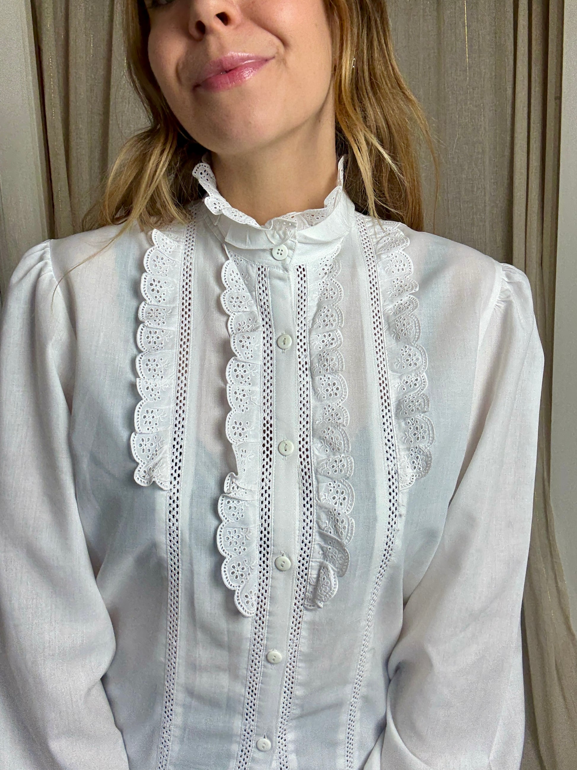This is such a stunning blouse with gorgeous embroidered frill detail with gathered sleeves and a Victorian style collar