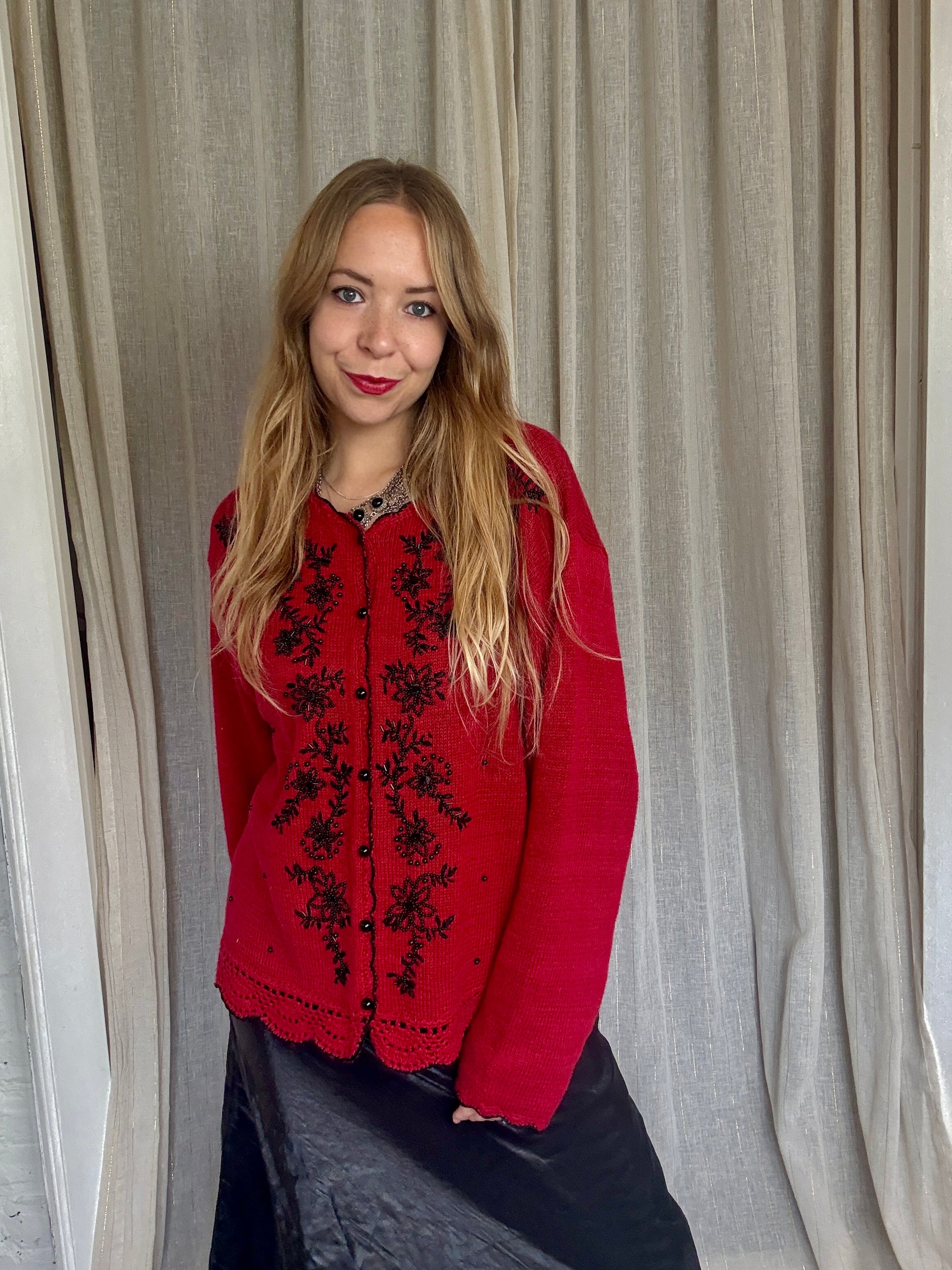 VINTAGE RED BEADED MILLIE CARDIGAN - UK 8-14